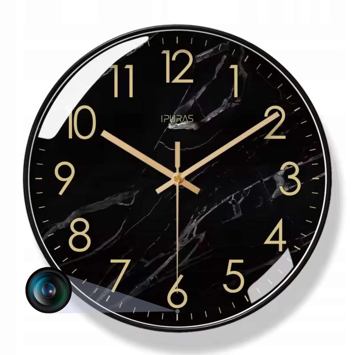 Monitoruj przestrzeń z nowoczesną kamerą w formie prawdziwego i działającego zegara ściennego z czarną tarczą w przepięknej złotej obudowie. Kontroluj godzinę i jednocześnie nagrywaj otoczenie. Wysoka jakość wideo i audio, a także pomysłowy design zapewnią Ci spokój, komfort i bezpieczeństwo!